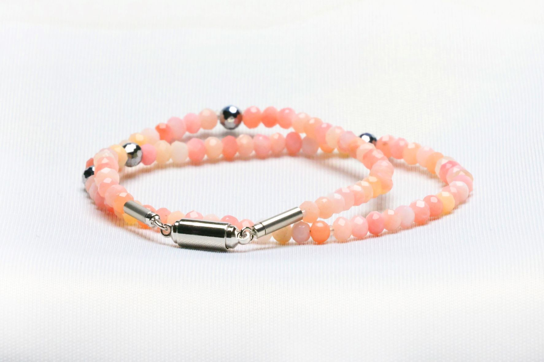 天然石ピンクコモンオパールとテラヘルツを組み合わせて二重巻きにしてかわいらしくスタイリッシュなブレスレットに仕上げました。